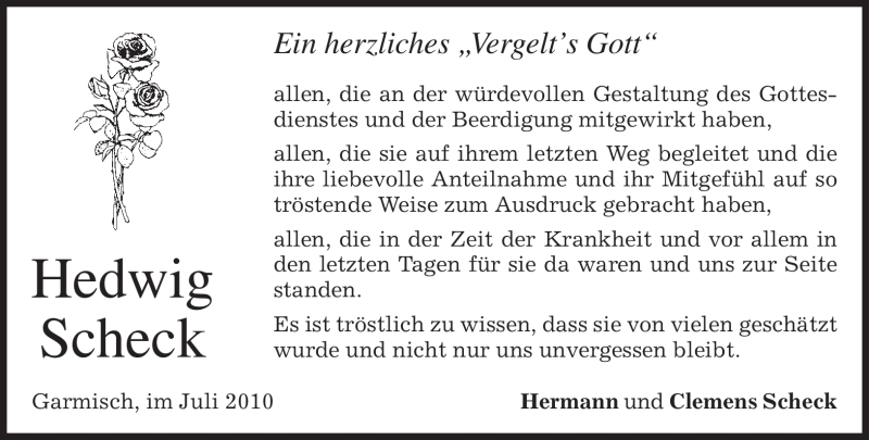 Hier finden Sie alle Traueranzeigen aus der Zeitung, die bisher für Hedwig Scheck erschienen sind. Weitere Traueranzeigen, die in der Zeitung erscheinen, werden hier ebenfalls aufgelistet