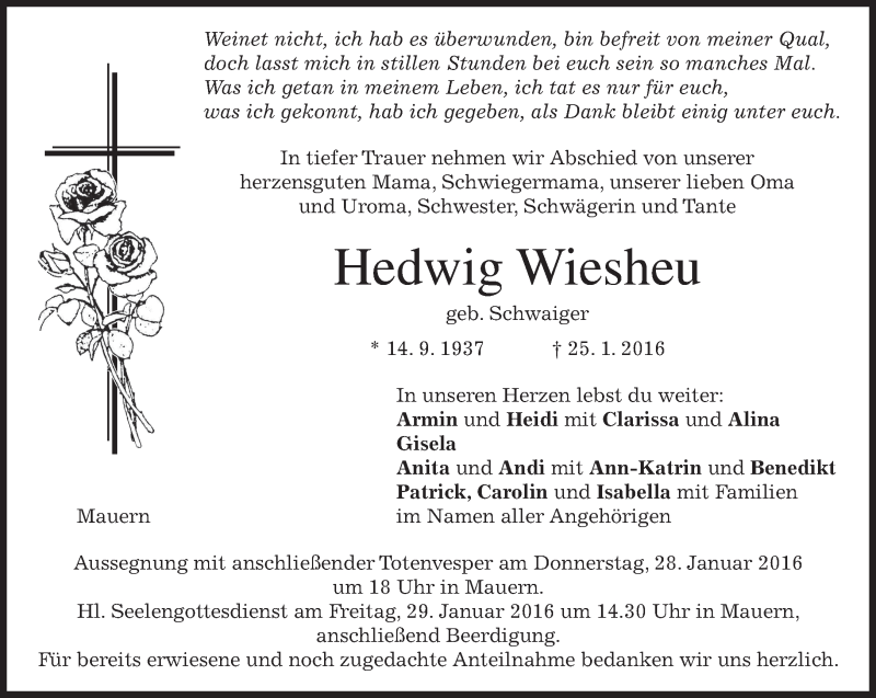 Hier finden Sie alle Traueranzeigen aus der Zeitung, die bisher für Hedwig Wiesheu erschienen sind. Weitere Traueranzeigen, die in der Zeitung erscheinen, werden hier ebenfalls aufgelistet