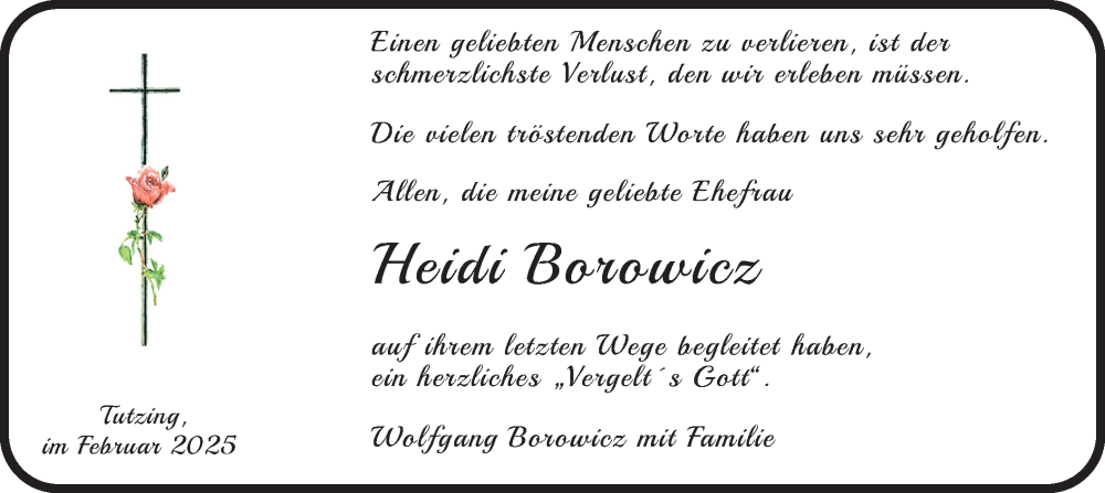 Hier finden Sie alle Traueranzeigen aus der Zeitung, die bisher für Heidi Borowicz erschienen sind. Weitere Traueranzeigen, die in der Zeitung erscheinen, werden hier ebenfalls aufgelistet
