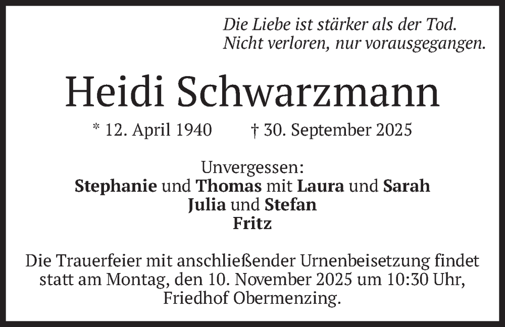 Hier finden Sie alle Traueranzeigen aus der Zeitung, die bisher für Heidi Schwarzmann erschienen sind. Weitere Traueranzeigen, die in der Zeitung erscheinen, werden hier ebenfalls aufgelistet