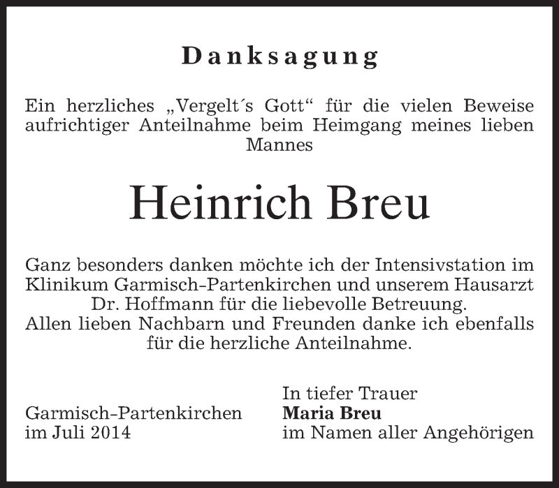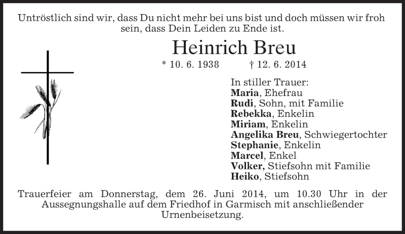 Hier finden Sie alle Traueranzeigen aus der Zeitung, die bisher für Heinrich Breu erschienen sind. Weitere Traueranzeigen, die in der Zeitung erscheinen, werden hier ebenfalls aufgelistet
