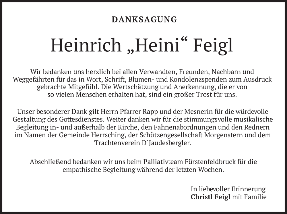 Hier finden Sie alle Traueranzeigen aus der Zeitung, die bisher für Heinrich Feigl erschienen sind. Weitere Traueranzeigen, die in der Zeitung erscheinen, werden hier ebenfalls aufgelistet
