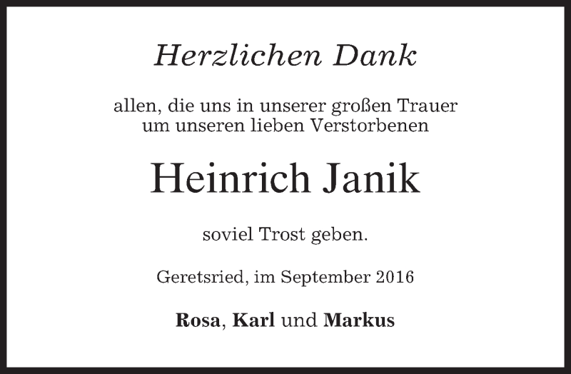 Hier finden Sie alle Traueranzeigen aus der Zeitung, die bisher für Heinrich Janik erschienen sind. Weitere Traueranzeigen, die in der Zeitung erscheinen, werden hier ebenfalls aufgelistet