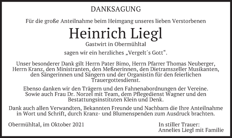Hier finden Sie alle Traueranzeigen aus der Zeitung, die bisher für Heinrich Liegl erschienen sind. Weitere Traueranzeigen, die in der Zeitung erscheinen, werden hier ebenfalls aufgelistet