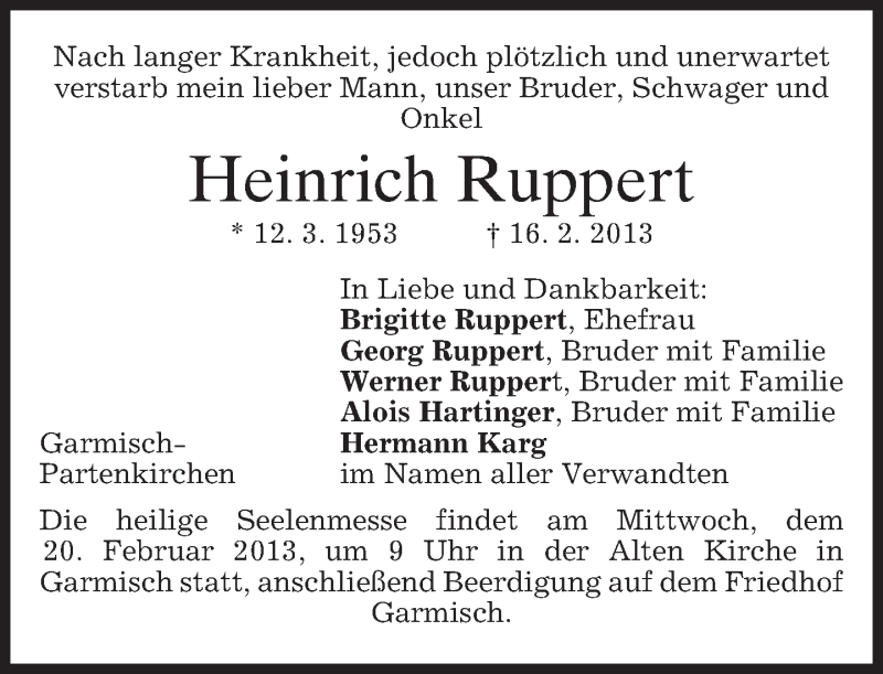 Hier finden Sie alle Traueranzeigen aus der Zeitung, die bisher für Heinrich Ruppert erschienen sind. Weitere Traueranzeigen, die in der Zeitung erscheinen, werden hier ebenfalls aufgelistet