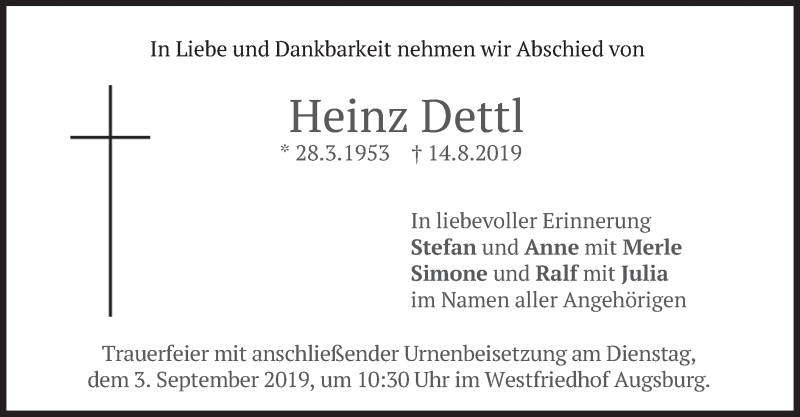 Hier finden Sie alle Traueranzeigen aus der Zeitung, die bisher für Heinz Dettl erschienen sind. Weitere Traueranzeigen, die in der Zeitung erscheinen, werden hier ebenfalls aufgelistet