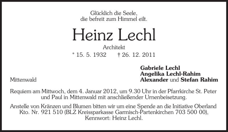 Hier finden Sie alle Traueranzeigen aus der Zeitung, die bisher für Heinz Lechl erschienen sind. Weitere Traueranzeigen, die in der Zeitung erscheinen, werden hier ebenfalls aufgelistet