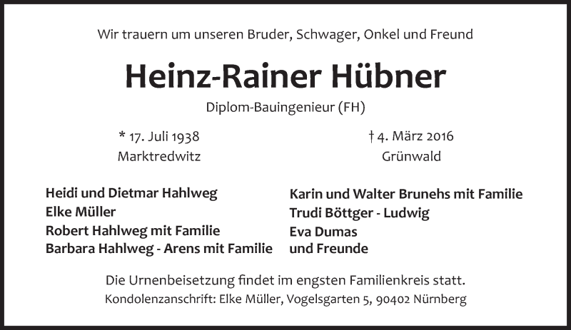 Hier finden Sie alle Traueranzeigen aus der Zeitung, die bisher für Heinz-Rainer Hübner erschienen sind. Weitere Traueranzeigen, die in der Zeitung erscheinen, werden hier ebenfalls aufgelistet