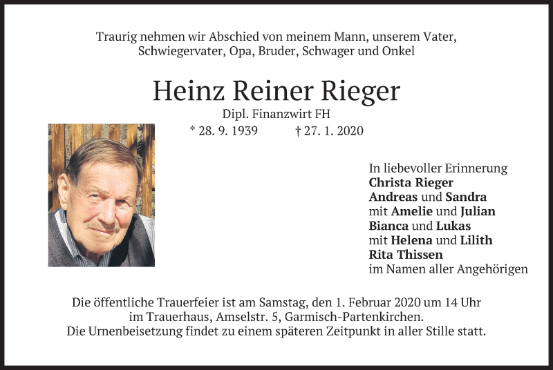 Hier finden Sie alle Traueranzeigen aus der Zeitung, die bisher für Heinz Reiner Rieger erschienen sind. Weitere Traueranzeigen, die in der Zeitung erscheinen, werden hier ebenfalls aufgelistet