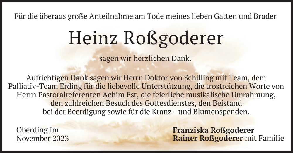 Hier finden Sie alle Traueranzeigen aus der Zeitung, die bisher für Heinz Roßgoderer erschienen sind. Weitere Traueranzeigen, die in der Zeitung erscheinen, werden hier ebenfalls aufgelistet