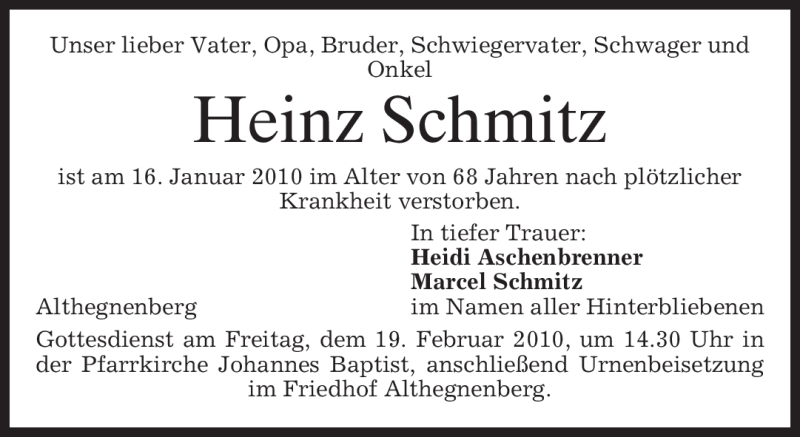 Hier finden Sie alle Traueranzeigen aus der Zeitung, die bisher für Heinz Schmitz erschienen sind. Weitere Traueranzeigen, die in der Zeitung erscheinen, werden hier ebenfalls aufgelistet