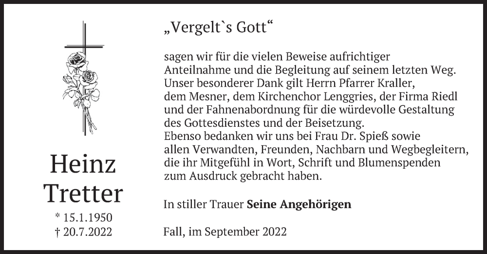 Hier finden Sie alle Traueranzeigen aus der Zeitung, die bisher für Heinz Tretter erschienen sind. Weitere Traueranzeigen, die in der Zeitung erscheinen, werden hier ebenfalls aufgelistet