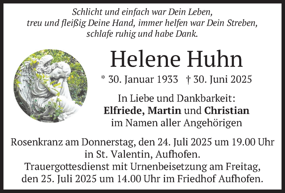 Hier finden Sie alle Traueranzeigen aus der Zeitung, die bisher für Helene Huhn erschienen sind. Weitere Traueranzeigen, die in der Zeitung erscheinen, werden hier ebenfalls aufgelistet
