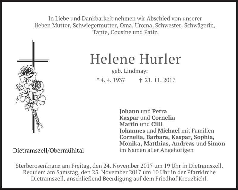 Hier finden Sie alle Traueranzeigen aus der Zeitung, die bisher für Helene Hurler erschienen sind. Weitere Traueranzeigen, die in der Zeitung erscheinen, werden hier ebenfalls aufgelistet