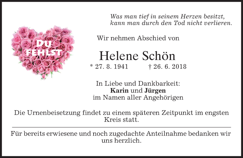 Hier finden Sie alle Traueranzeigen aus der Zeitung, die bisher für Helene Schön erschienen sind. Weitere Traueranzeigen, die in der Zeitung erscheinen, werden hier ebenfalls aufgelistet