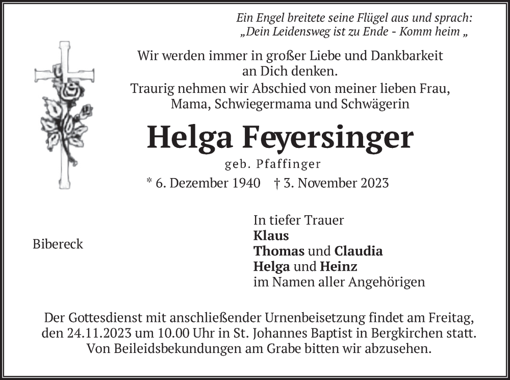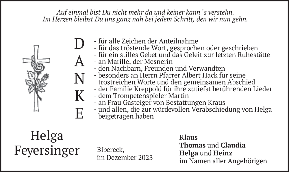 Hier finden Sie alle Traueranzeigen aus der Zeitung, die bisher für Helga Feyersinger erschienen sind. Weitere Traueranzeigen, die in der Zeitung erscheinen, werden hier ebenfalls aufgelistet