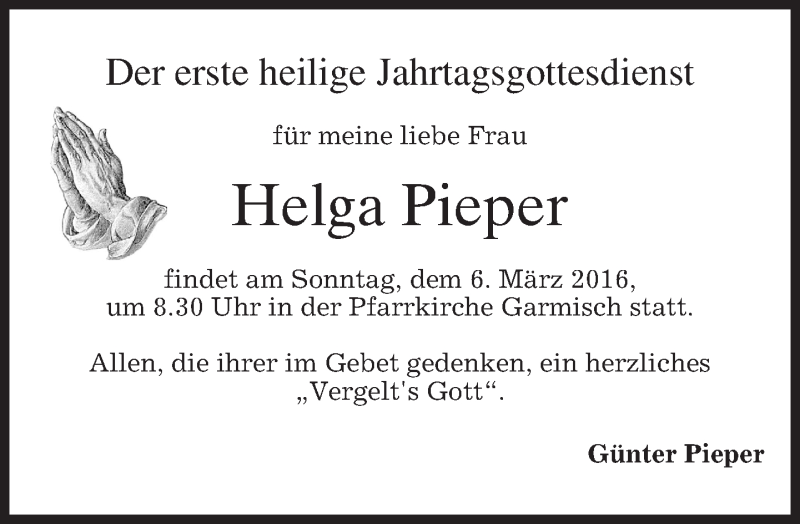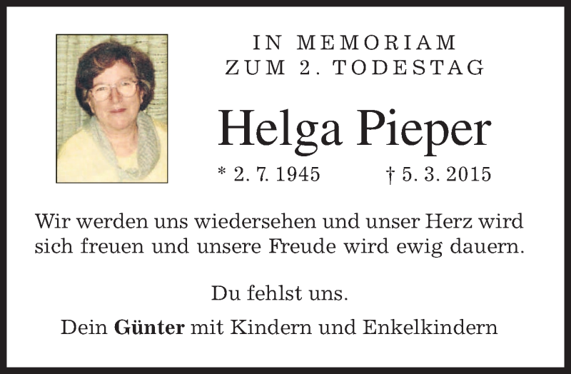 Hier finden Sie alle Traueranzeigen aus der Zeitung, die bisher für Helga Pieper erschienen sind. Weitere Traueranzeigen, die in der Zeitung erscheinen, werden hier ebenfalls aufgelistet