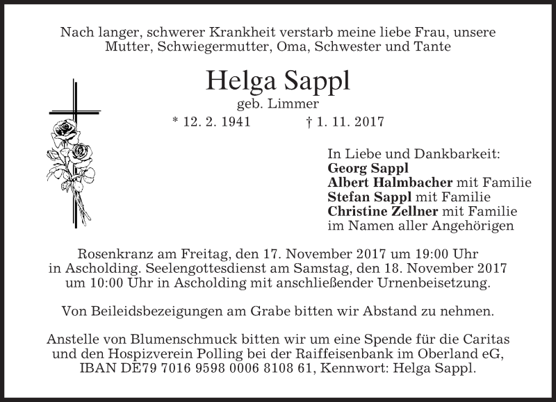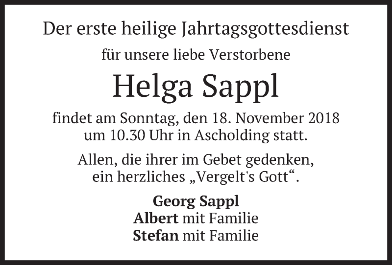 Hier finden Sie alle Traueranzeigen aus der Zeitung, die bisher für Helga Sappl erschienen sind. Weitere Traueranzeigen, die in der Zeitung erscheinen, werden hier ebenfalls aufgelistet
