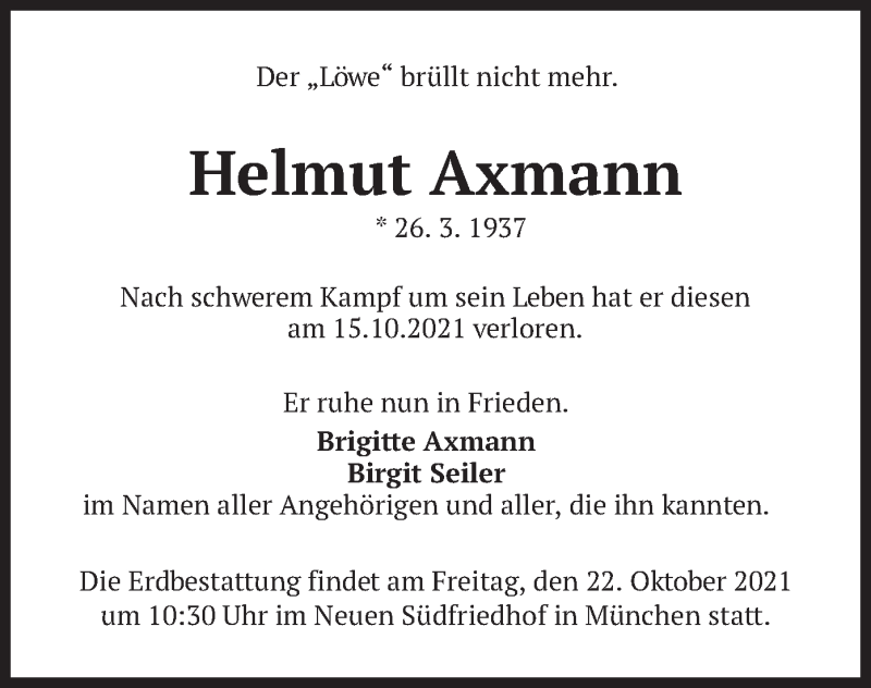 Hier finden Sie alle Traueranzeigen aus der Zeitung, die bisher für Helmut Axmann erschienen sind. Weitere Traueranzeigen, die in der Zeitung erscheinen, werden hier ebenfalls aufgelistet