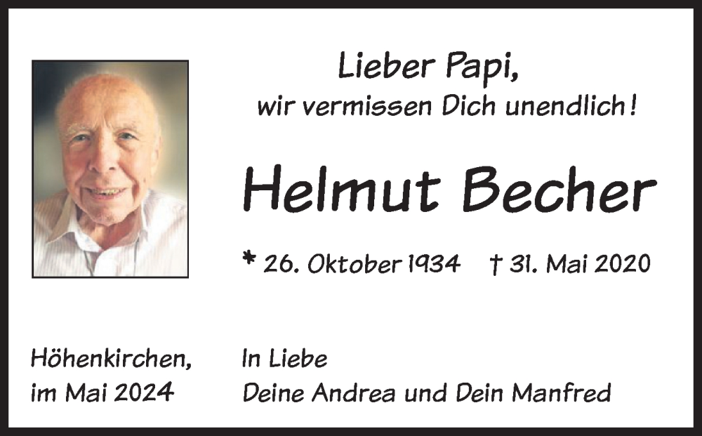 Hier finden Sie alle Traueranzeigen aus der Zeitung, die bisher für Helmut Becher erschienen sind. Weitere Traueranzeigen, die in der Zeitung erscheinen, werden hier ebenfalls aufgelistet