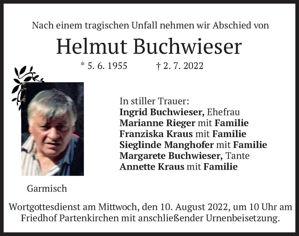 Hier finden Sie alle Traueranzeigen aus der Zeitung, die bisher für Helmut Buchwieser erschienen sind. Weitere Traueranzeigen, die in der Zeitung erscheinen, werden hier ebenfalls aufgelistet