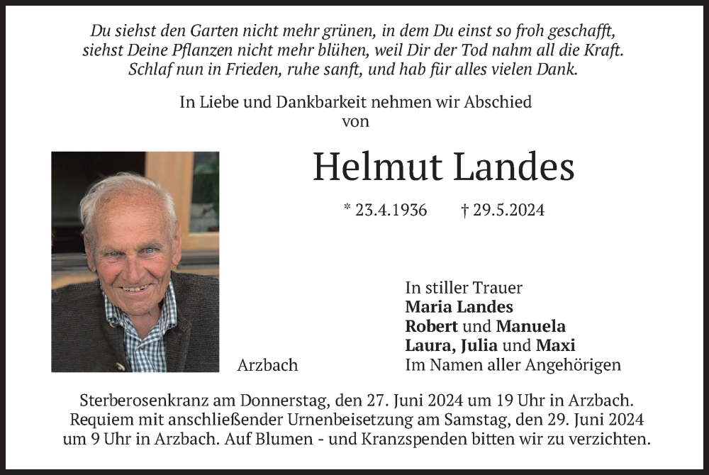 Hier finden Sie alle Traueranzeigen aus der Zeitung, die bisher für Helmut Landes erschienen sind. Weitere Traueranzeigen, die in der Zeitung erscheinen, werden hier ebenfalls aufgelistet