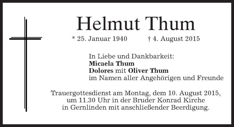 Hier finden Sie alle Traueranzeigen aus der Zeitung, die bisher für Helmut Thum erschienen sind. Weitere Traueranzeigen, die in der Zeitung erscheinen, werden hier ebenfalls aufgelistet