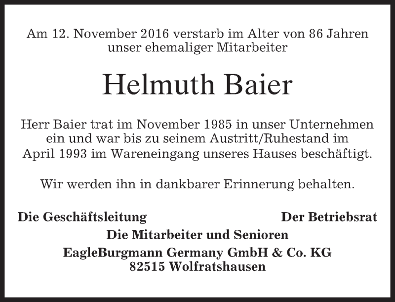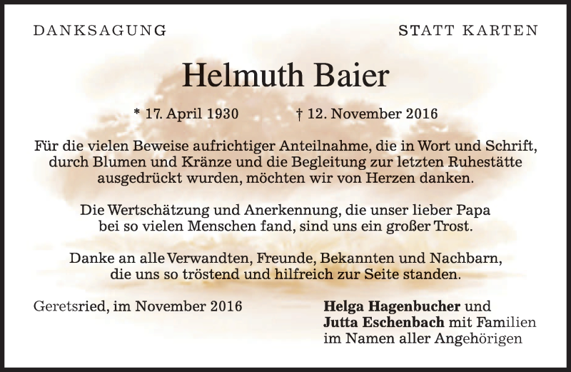 Hier finden Sie alle Traueranzeigen aus der Zeitung, die bisher für Helmuth Baier erschienen sind. Weitere Traueranzeigen, die in der Zeitung erscheinen, werden hier ebenfalls aufgelistet