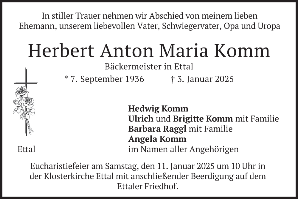 Hier finden Sie alle Traueranzeigen aus der Zeitung, die bisher für Herbert Anton Maria Komm erschienen sind. Weitere Traueranzeigen, die in der Zeitung erscheinen, werden hier ebenfalls aufgelistet