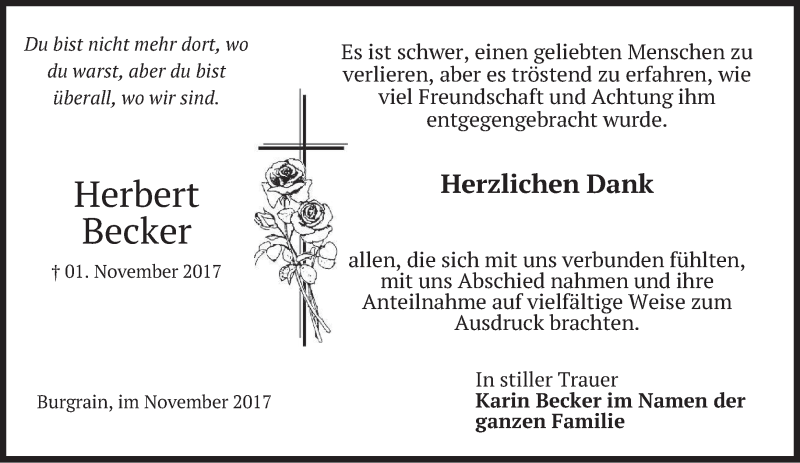 Hier finden Sie alle Traueranzeigen aus der Zeitung, die bisher für Herbert Becker erschienen sind. Weitere Traueranzeigen, die in der Zeitung erscheinen, werden hier ebenfalls aufgelistet