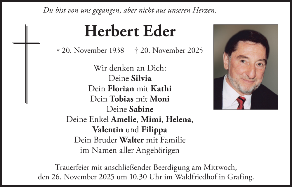 Hier finden Sie alle Traueranzeigen aus der Zeitung, die bisher für Herbert Eder erschienen sind. Weitere Traueranzeigen, die in der Zeitung erscheinen, werden hier ebenfalls aufgelistet