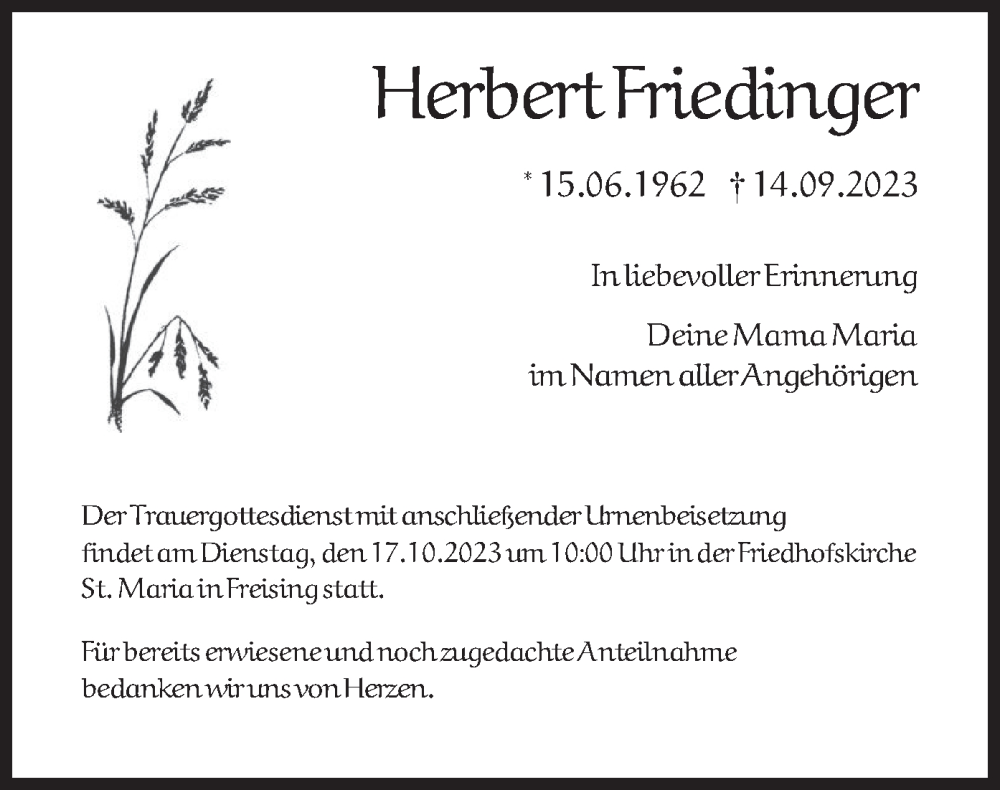 Hier finden Sie alle Traueranzeigen aus der Zeitung, die bisher für Herbert Friedinger erschienen sind. Weitere Traueranzeigen, die in der Zeitung erscheinen, werden hier ebenfalls aufgelistet