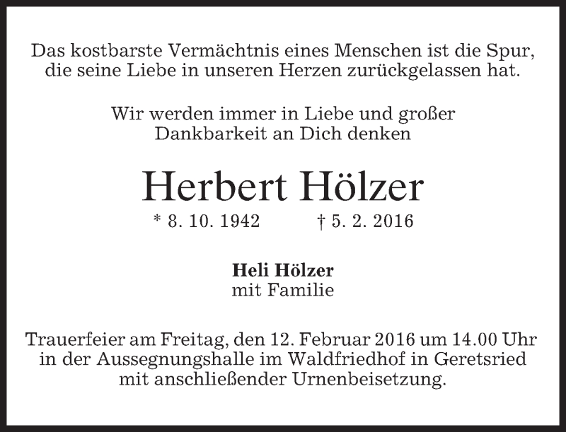 Hier finden Sie alle Traueranzeigen aus der Zeitung, die bisher für Herbert Hölzer erschienen sind. Weitere Traueranzeigen, die in der Zeitung erscheinen, werden hier ebenfalls aufgelistet