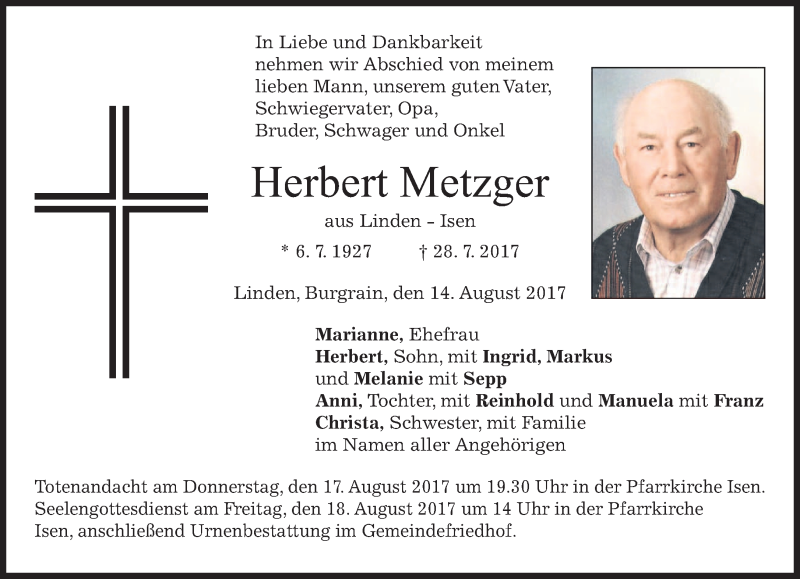 Hier finden Sie alle Traueranzeigen aus der Zeitung, die bisher für Herbert Metzger erschienen sind. Weitere Traueranzeigen, die in der Zeitung erscheinen, werden hier ebenfalls aufgelistet