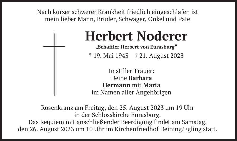 Hier finden Sie alle Traueranzeigen aus der Zeitung, die bisher für Herbert Noderer erschienen sind. Weitere Traueranzeigen, die in der Zeitung erscheinen, werden hier ebenfalls aufgelistet