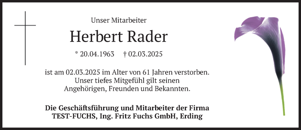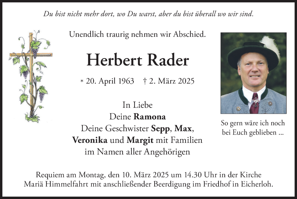 Hier finden Sie alle Traueranzeigen aus der Zeitung, die bisher für Herbert Rader erschienen sind. Weitere Traueranzeigen, die in der Zeitung erscheinen, werden hier ebenfalls aufgelistet