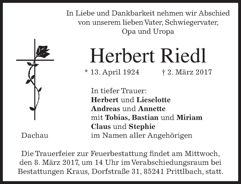 Hier finden Sie alle Traueranzeigen aus der Zeitung, die bisher für Herbert Riedl erschienen sind. Weitere Traueranzeigen, die in der Zeitung erscheinen, werden hier ebenfalls aufgelistet