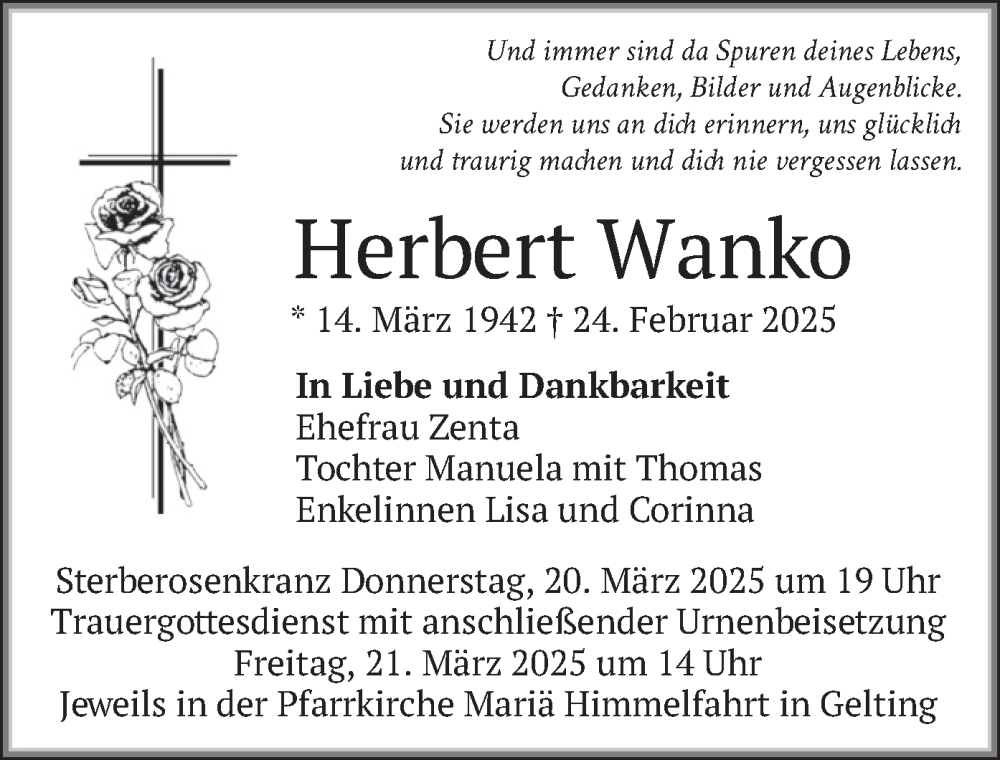 Hier finden Sie alle Traueranzeigen aus der Zeitung, die bisher für Herbert Wanko erschienen sind. Weitere Traueranzeigen, die in der Zeitung erscheinen, werden hier ebenfalls aufgelistet