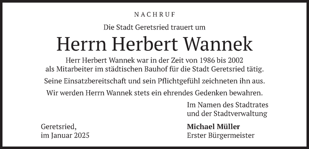 Hier finden Sie alle Traueranzeigen aus der Zeitung, die bisher für Herbert Wannek erschienen sind. Weitere Traueranzeigen, die in der Zeitung erscheinen, werden hier ebenfalls aufgelistet