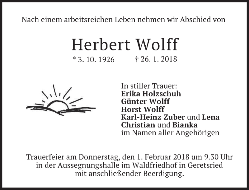 Hier finden Sie alle Traueranzeigen aus der Zeitung, die bisher für Herbert Wolff erschienen sind. Weitere Traueranzeigen, die in der Zeitung erscheinen, werden hier ebenfalls aufgelistet