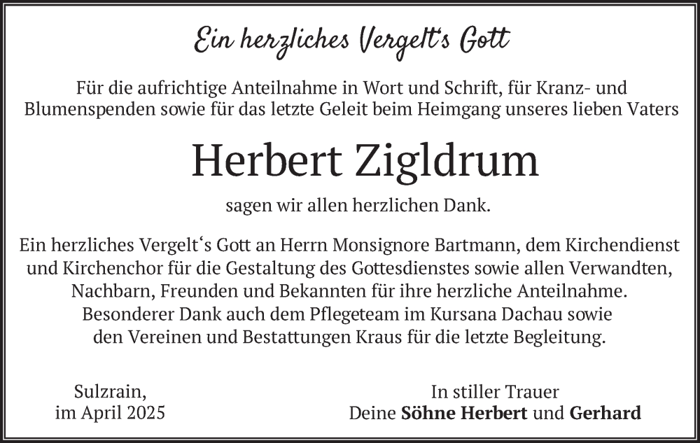 Hier finden Sie alle Traueranzeigen aus der Zeitung, die bisher für Herbert Zigldrum erschienen sind. Weitere Traueranzeigen, die in der Zeitung erscheinen, werden hier ebenfalls aufgelistet