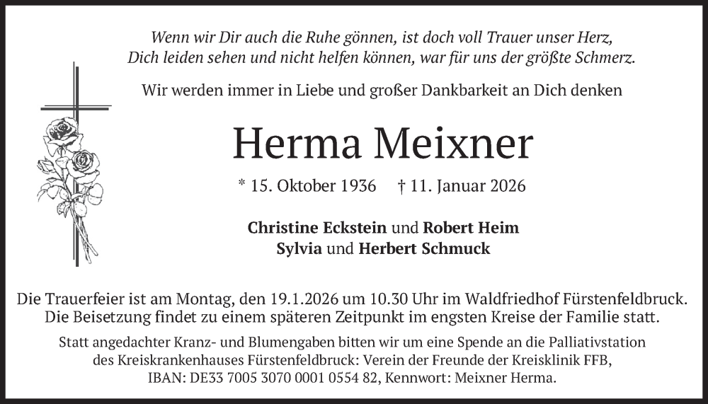 Hier finden Sie alle Traueranzeigen aus der Zeitung, die bisher für Herma Meixner erschienen sind. Weitere Traueranzeigen, die in der Zeitung erscheinen, werden hier ebenfalls aufgelistet