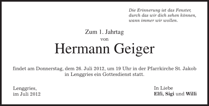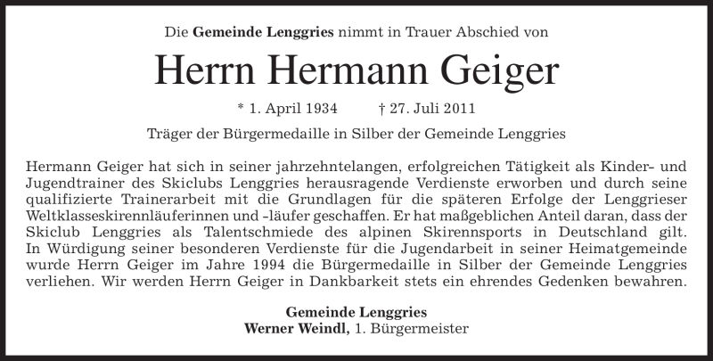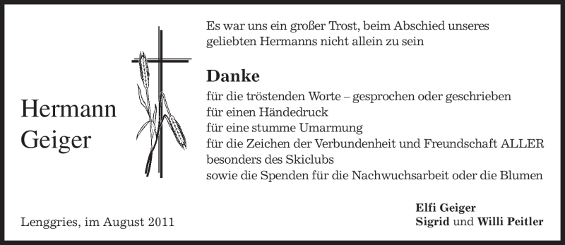 Hier finden Sie alle Traueranzeigen aus der Zeitung, die bisher für Hermann Geiger erschienen sind. Weitere Traueranzeigen, die in der Zeitung erscheinen, werden hier ebenfalls aufgelistet