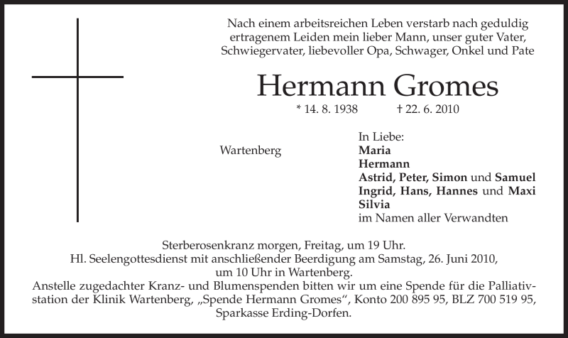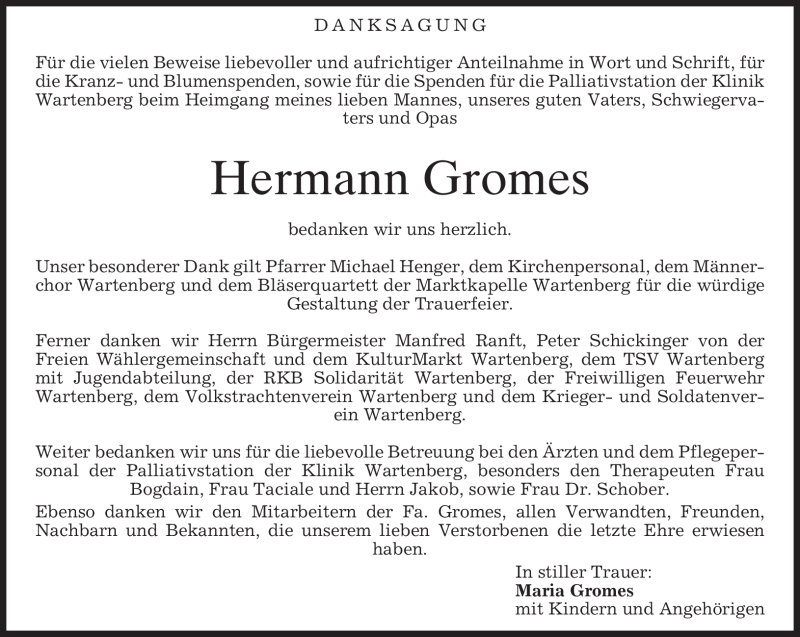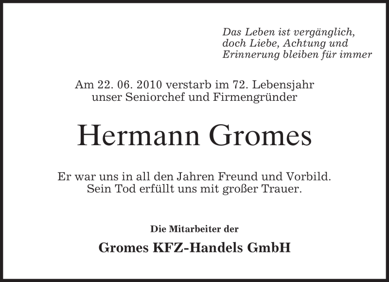 Hier finden Sie alle Traueranzeigen aus der Zeitung, die bisher für Hermann Gromes erschienen sind. Weitere Traueranzeigen, die in der Zeitung erscheinen, werden hier ebenfalls aufgelistet