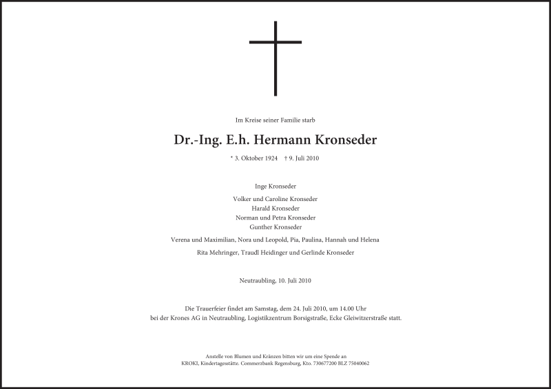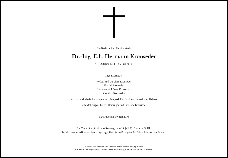 Hier finden Sie alle Traueranzeigen aus der Zeitung, die bisher für Hermann Kronseder erschienen sind. Weitere Traueranzeigen, die in der Zeitung erscheinen, werden hier ebenfalls aufgelistet