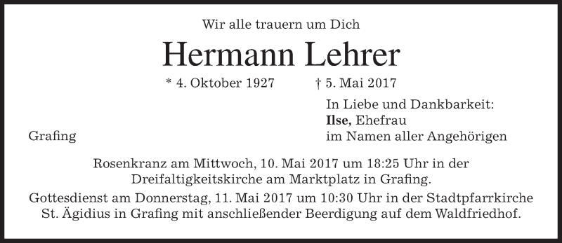 Hier finden Sie alle Traueranzeigen aus der Zeitung, die bisher für Hermann Lehrer erschienen sind. Weitere Traueranzeigen, die in der Zeitung erscheinen, werden hier ebenfalls aufgelistet