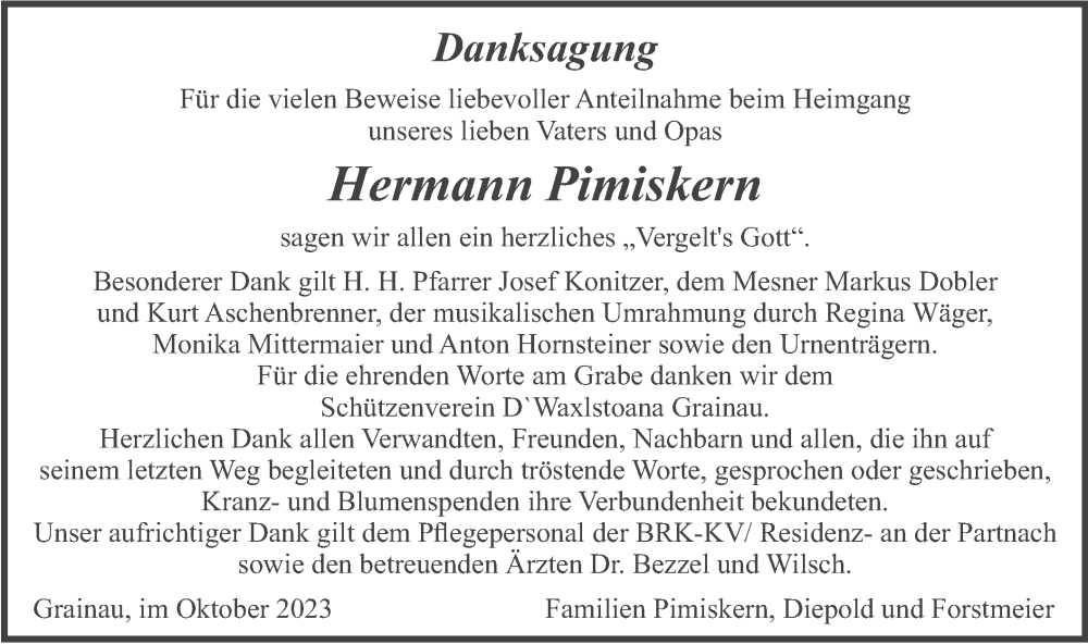 Hier finden Sie alle Traueranzeigen aus der Zeitung, die bisher für Hermann Pimiskern erschienen sind. Weitere Traueranzeigen, die in der Zeitung erscheinen, werden hier ebenfalls aufgelistet