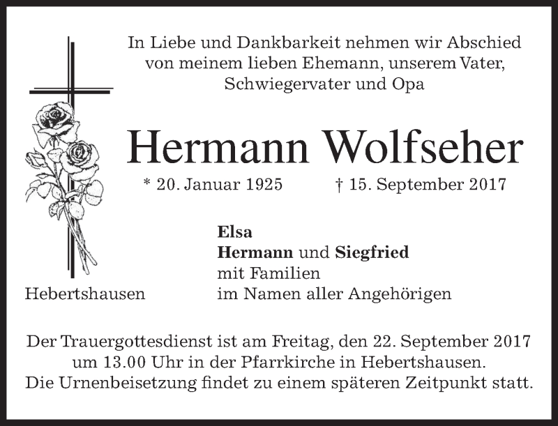 Hier finden Sie alle Traueranzeigen aus der Zeitung, die bisher für Hermann Wolfseher erschienen sind. Weitere Traueranzeigen, die in der Zeitung erscheinen, werden hier ebenfalls aufgelistet
