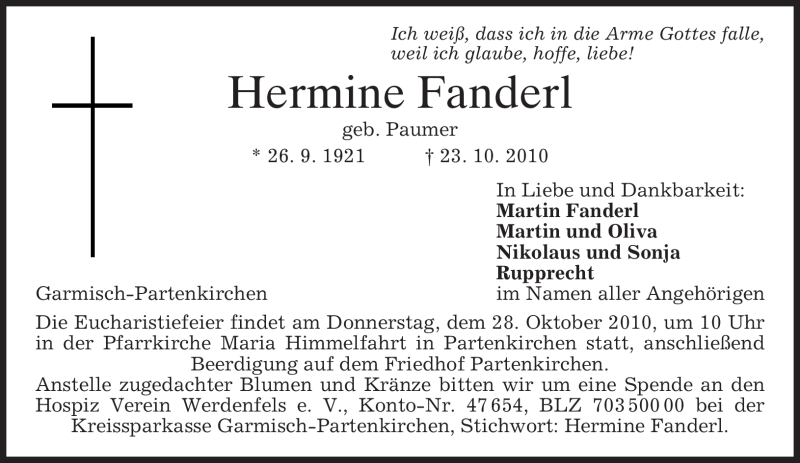 Hier finden Sie alle Traueranzeigen aus der Zeitung, die bisher für Hermine Fanderl erschienen sind. Weitere Traueranzeigen, die in der Zeitung erscheinen, werden hier ebenfalls aufgelistet