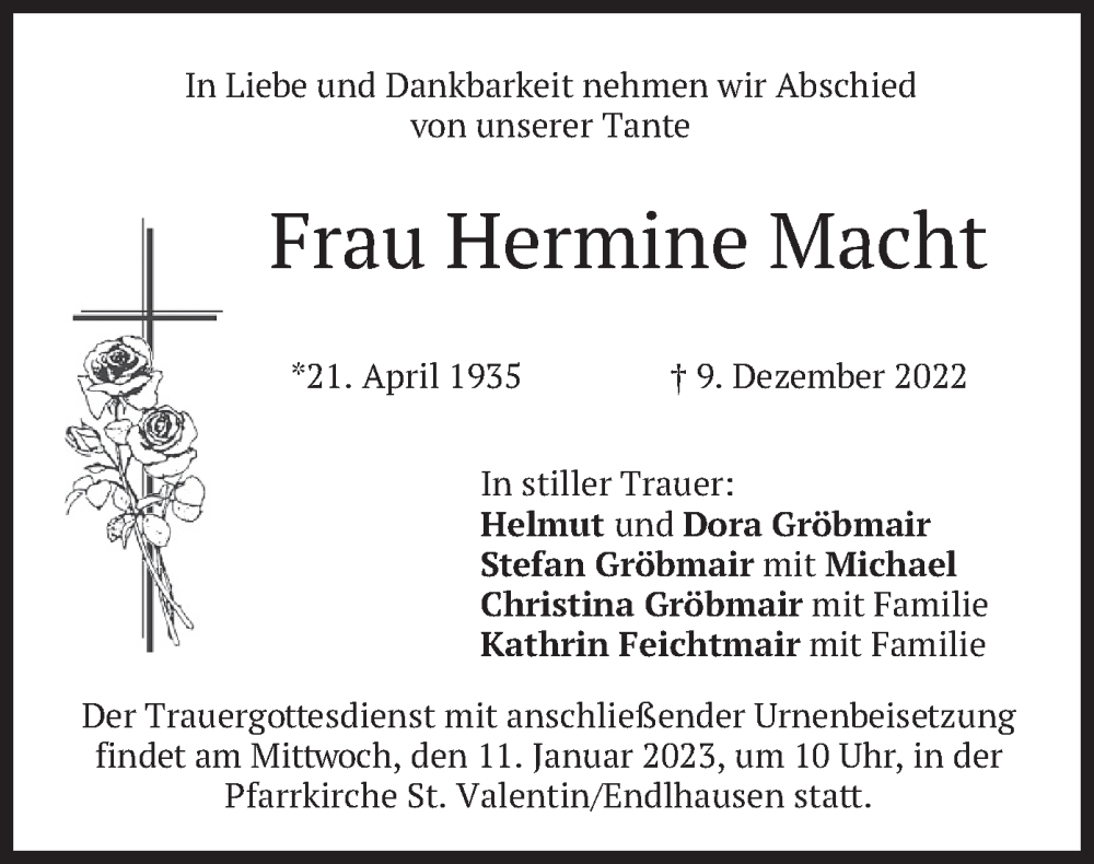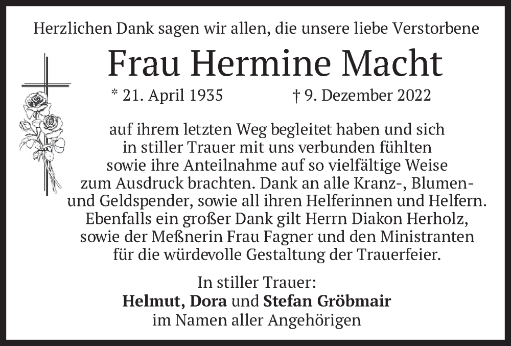 Hier finden Sie alle Traueranzeigen aus der Zeitung, die bisher für Hermine Macht erschienen sind. Weitere Traueranzeigen, die in der Zeitung erscheinen, werden hier ebenfalls aufgelistet
